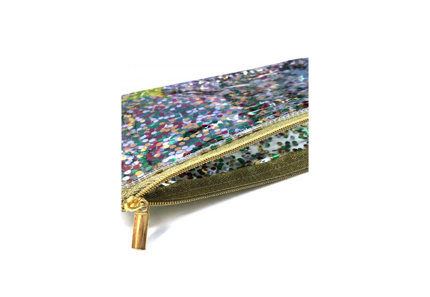 表面内側にスパンコールグリッターを閉じ込めたPVCポーチ。